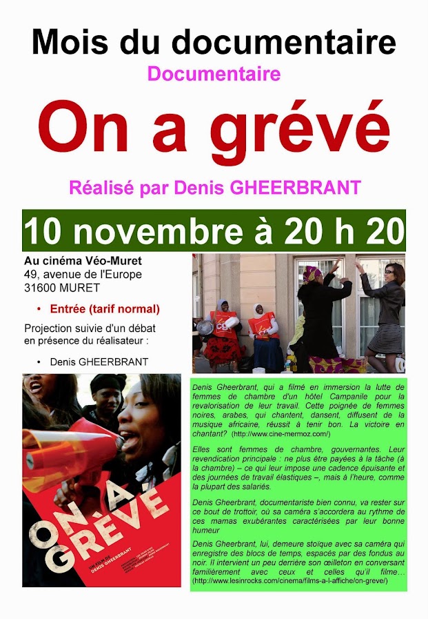 - lundi 10 novembre à 20h20: "On a grévé" projection suivie d'une rencontre avec le réalisateur Denis Gheerbrant, qui a filmé en immersion la lutte de femmes de chambre d'un hôtel Campanile pour la revalorisation de leur travail. Cette poignée de femmes noires, arabes, qui chantent, dansent, diffusent de la musique africaine, réussit à tenir bon. La victoire en chantant?